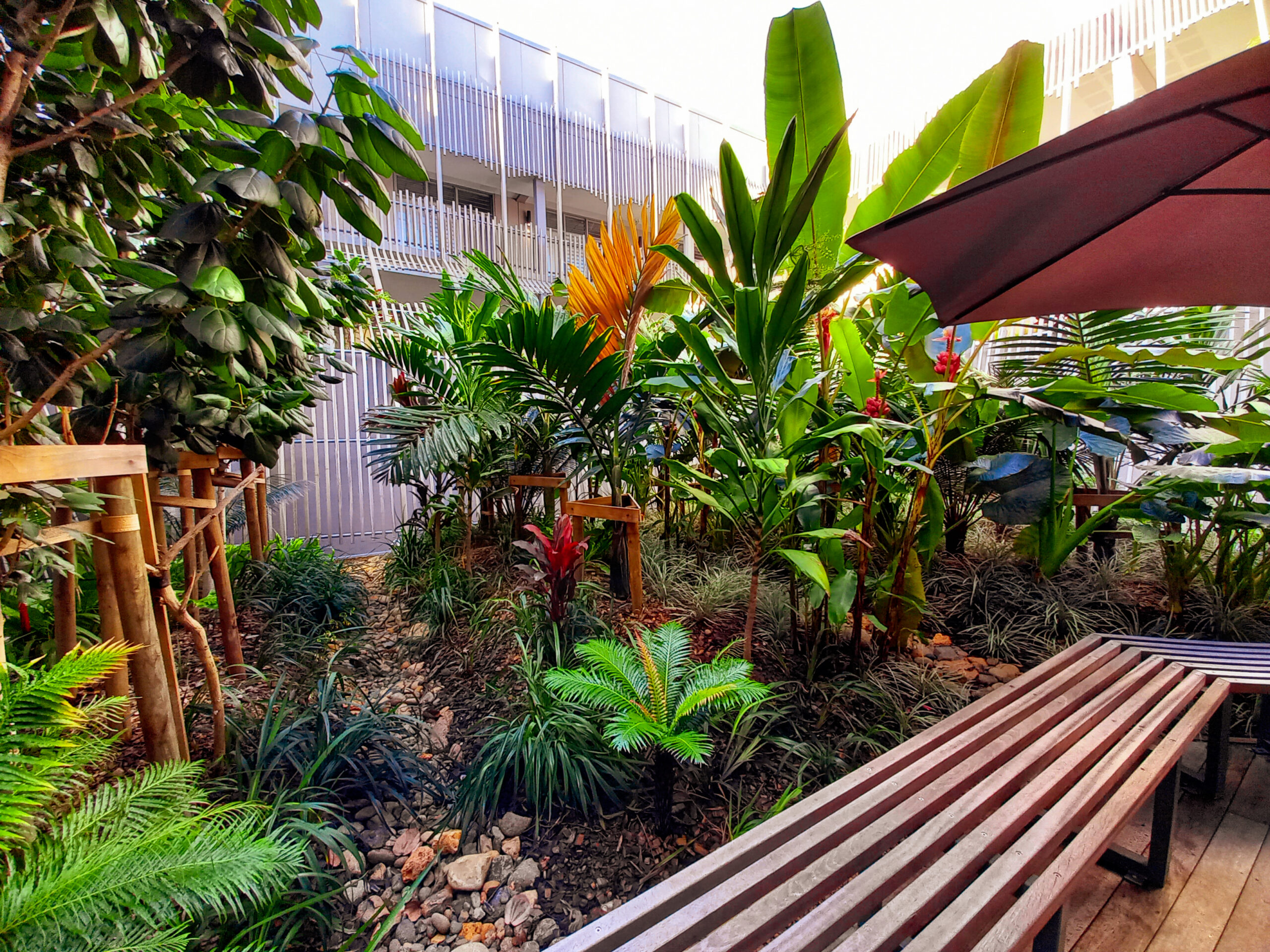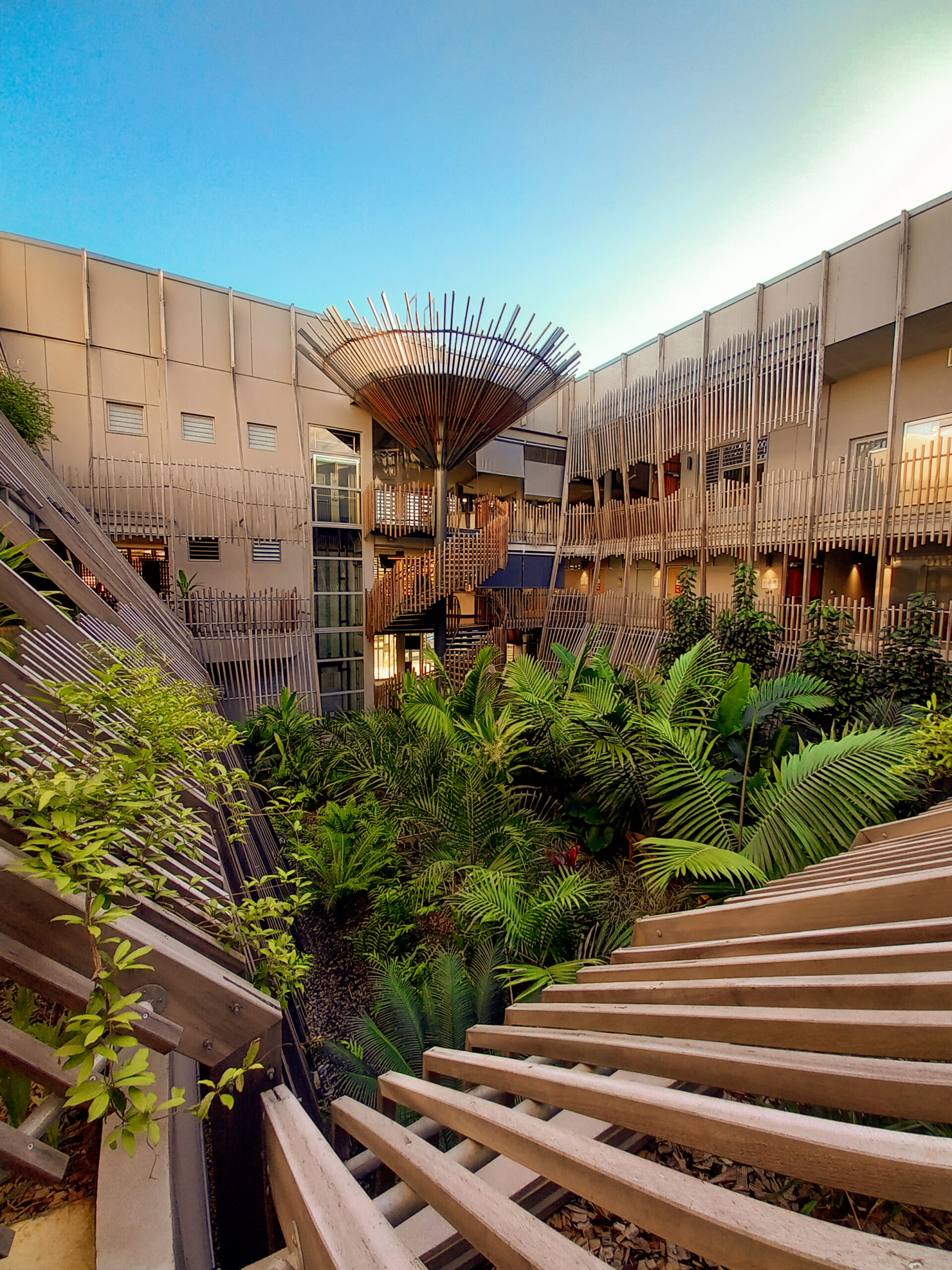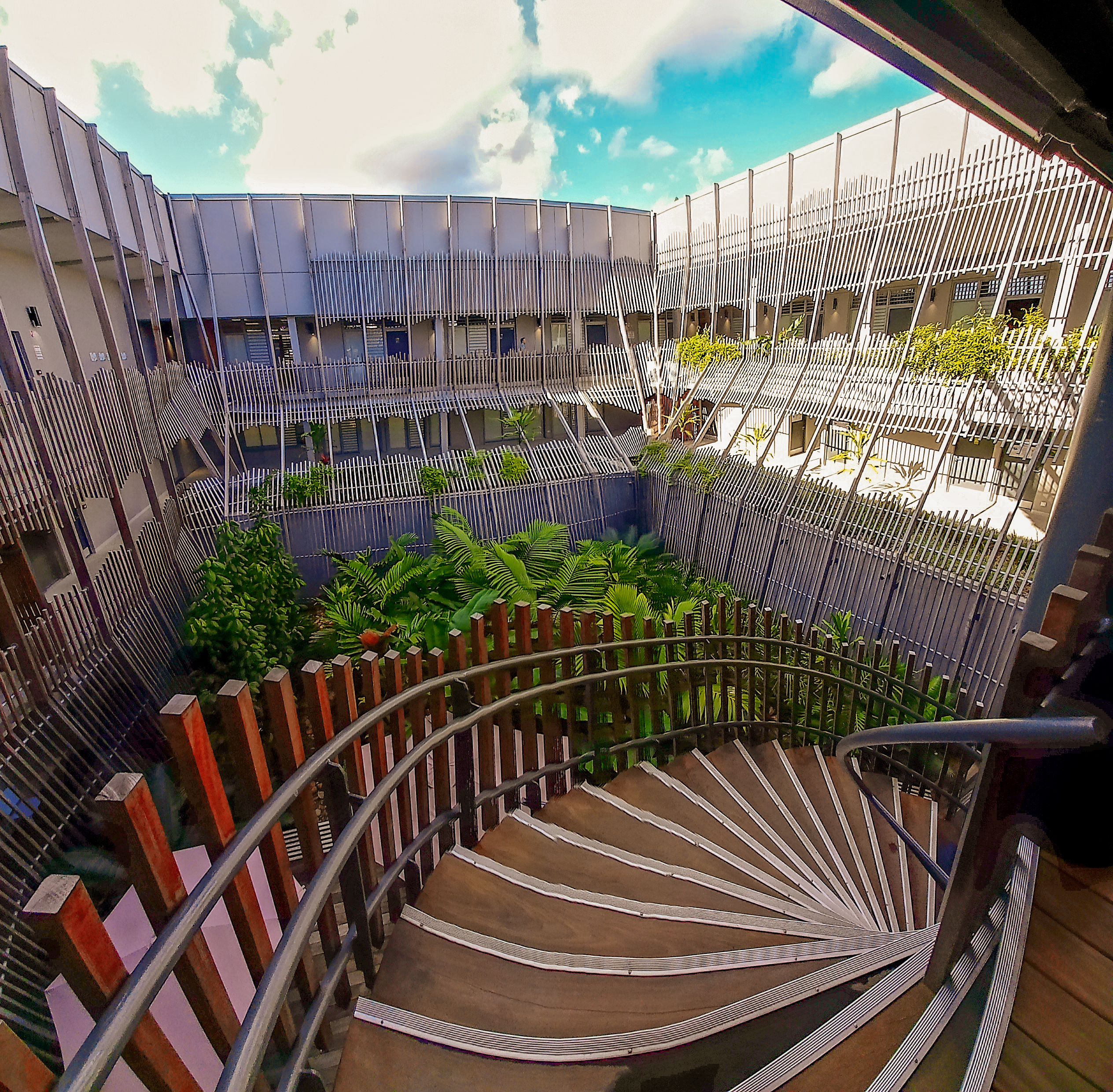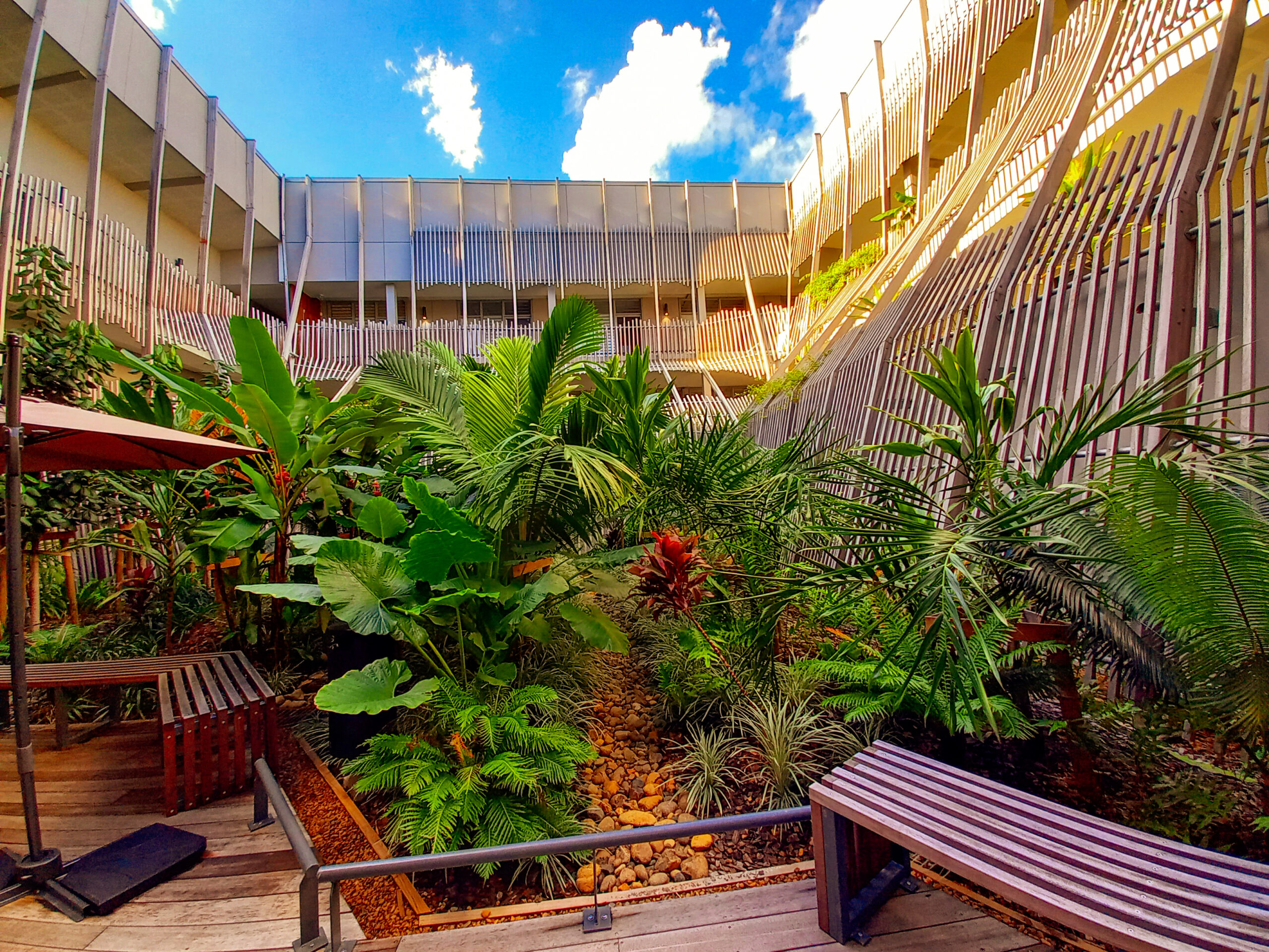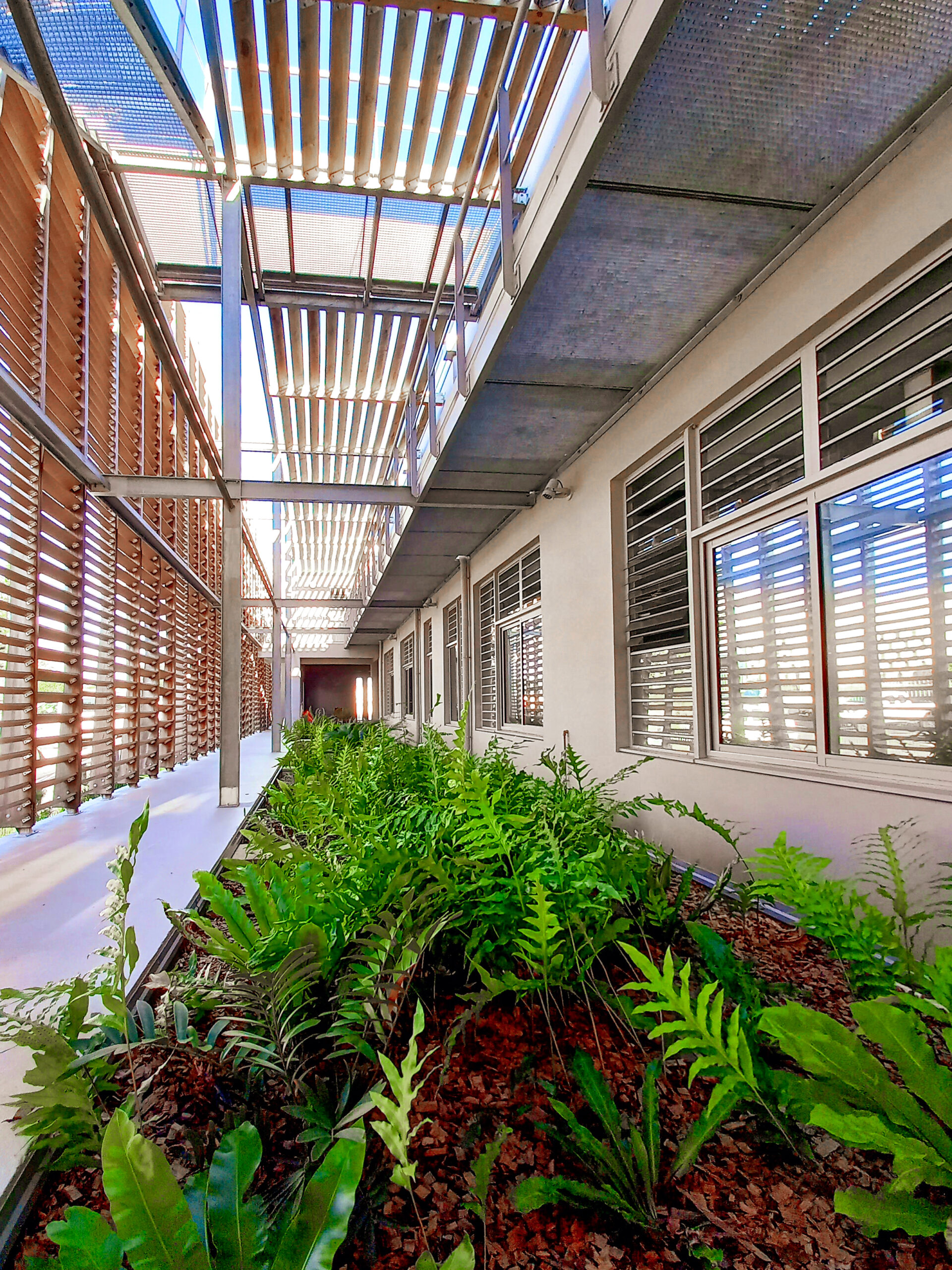 Par ailleurs, le projet intègre une approche sociale et culturelle. L’architecture et le paysage reflètent l’identité océanienne pour que les usagers puissent se reconnaître et se sentir à l’aise dans le lieu. En conséquence, le bâtiment s’organise autour d’un large patio central fortement végétalisé. Les locaux s’ouvrent sur des espaces semi extérieurs, protégés des intempéries et des nuisances urbaines.