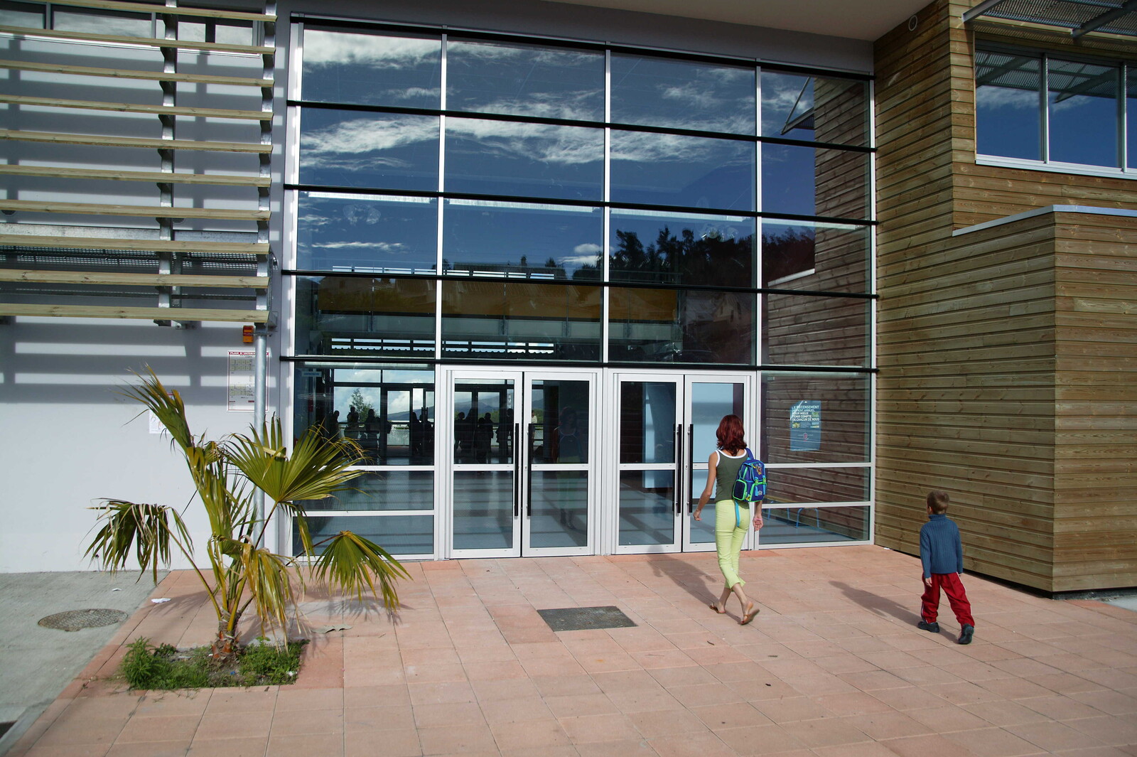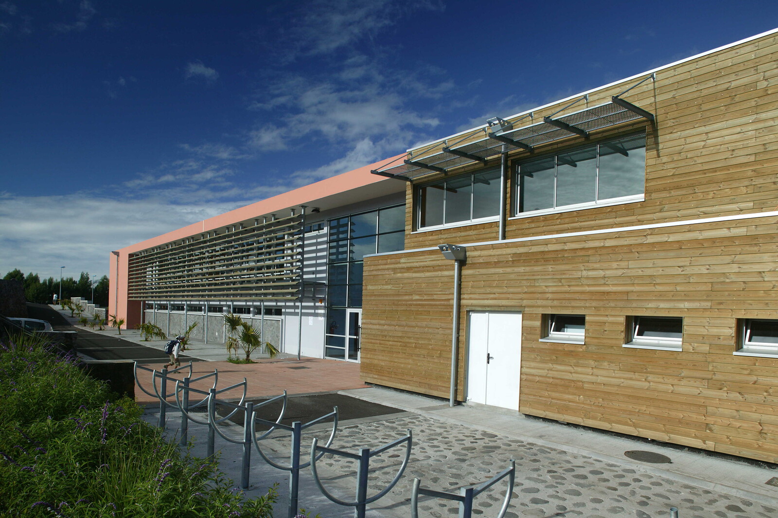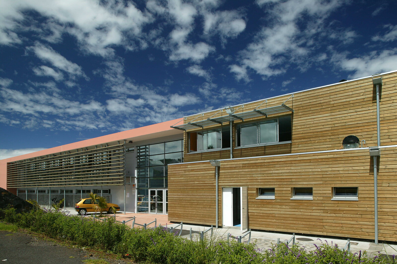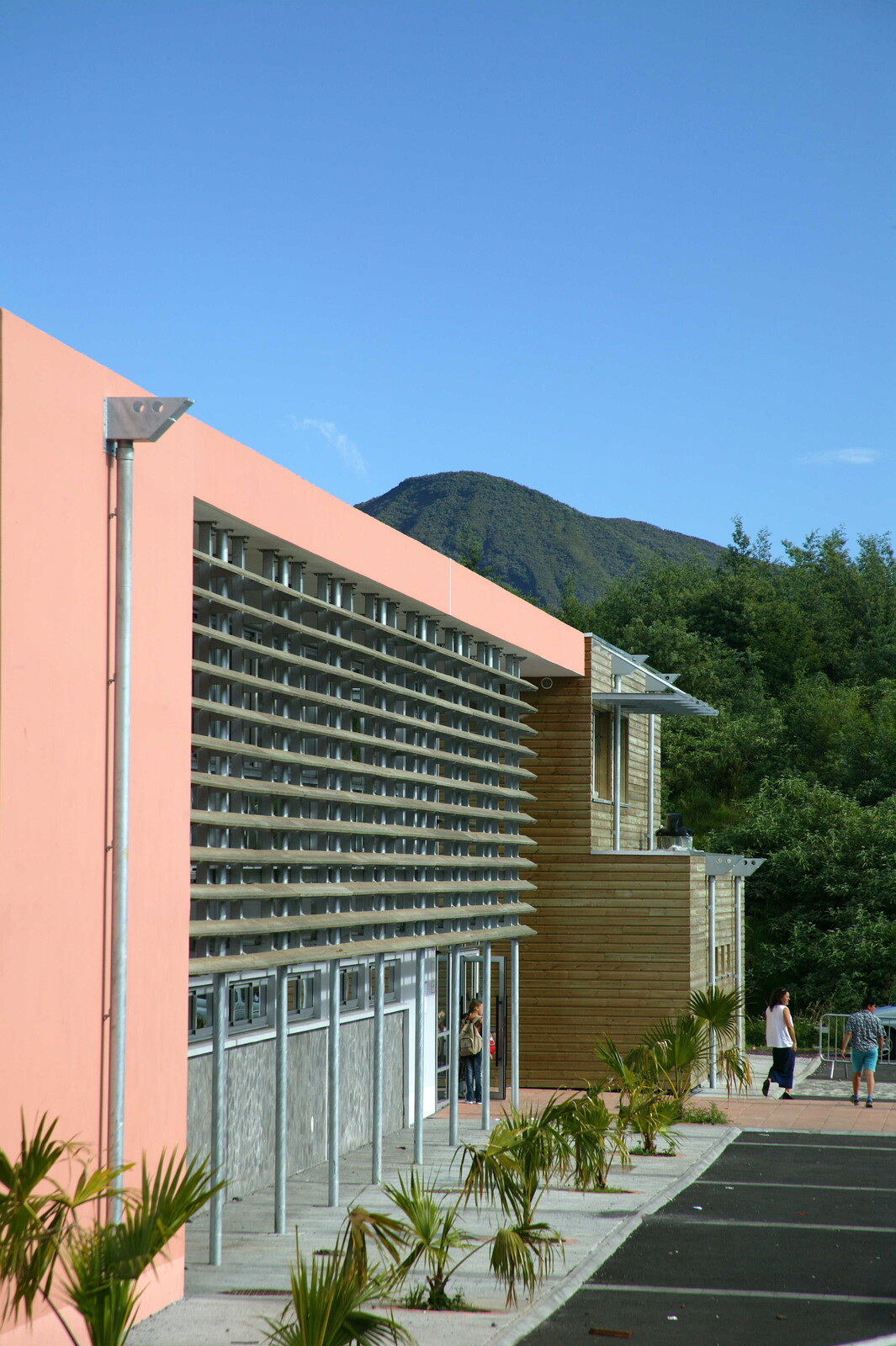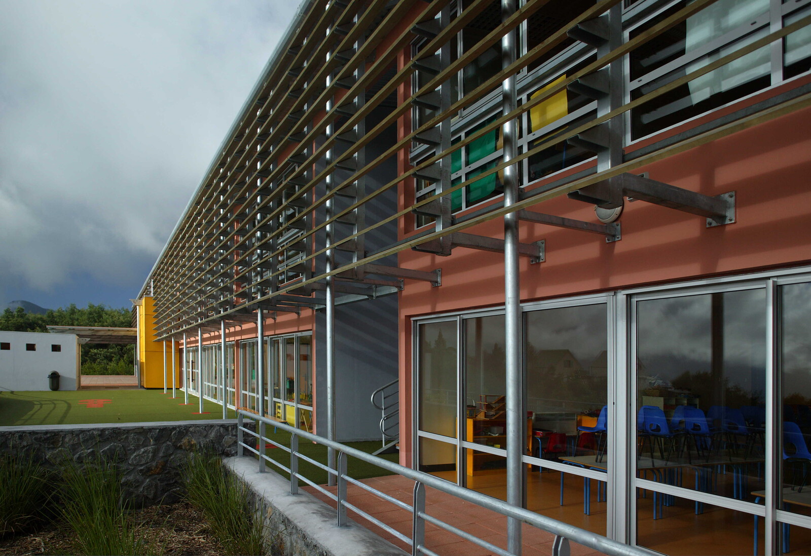 Le projet s’adapte à la topographie en suivant les courbes de niveau et en limitant son impact sur le territoire. Deux volumes clairs structurent l’ensemble : une halle ouverte sur la ravine et un bâtiment en barre marquant l’équipement public et s’orientant vers le paysage maritime et le Piton des Neiges. L’école maternelle et les espaces partagés prennent place dans la halle, tandis que les salles du primaire sont regroupées dans la barre. L’entrée centrale articule la cour des petits et celle des grands, favorisant une lecture fluide des espaces. Une architecture bioclimatique La conception tire parti du climat : protection des cours des vents dominants, orientation des classes vers les meilleures expositions et intégration d’espaces de jeux abrités pour la maternelle. Des espaces partagés ouverts La restauration, la salle de motricité et la bibliothèque constituent un cœur vivant de l’école, en relation directe avec le hall d’accueil et les cours. Ces espaces polyvalents peuvent accueillir des événements exceptionnels. Une évolutivité maîtrisée Pensé comme un équipement évolutif, le projet permet d’accueillir de futures extensions simples, garantissant sa pérennité et son adaptation aux besoins à venir.