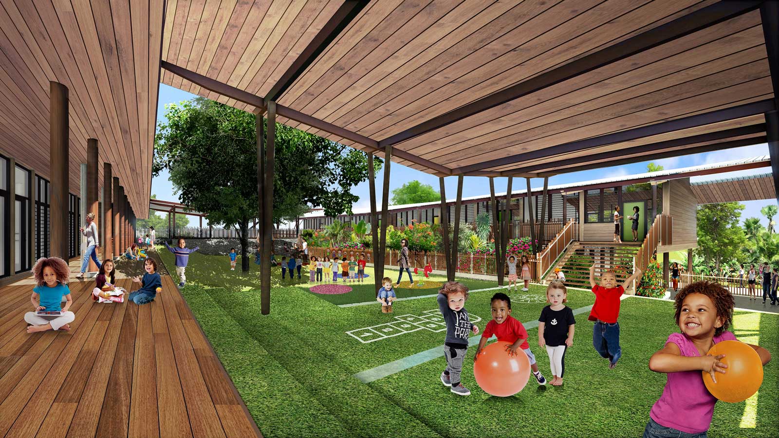 Situé au cœur du centre-ville historique, le projet de l’école Sainte-Rose s’inscrit dans un tissu urbain composé de maisons individuelles et de petits collectifs. En conservant une partie du gros œuvre existant, il propose une intégration harmonieuse grâce à des volumes simples et lisibles, surmontés de toitures qui affirment l’identité de l’école Sainte-Rose. L’horizontalité du bâtiment est mise en valeur par un grand toit, en résonance avec la silhouette des montagnes qui se dessinent en arrière-plan