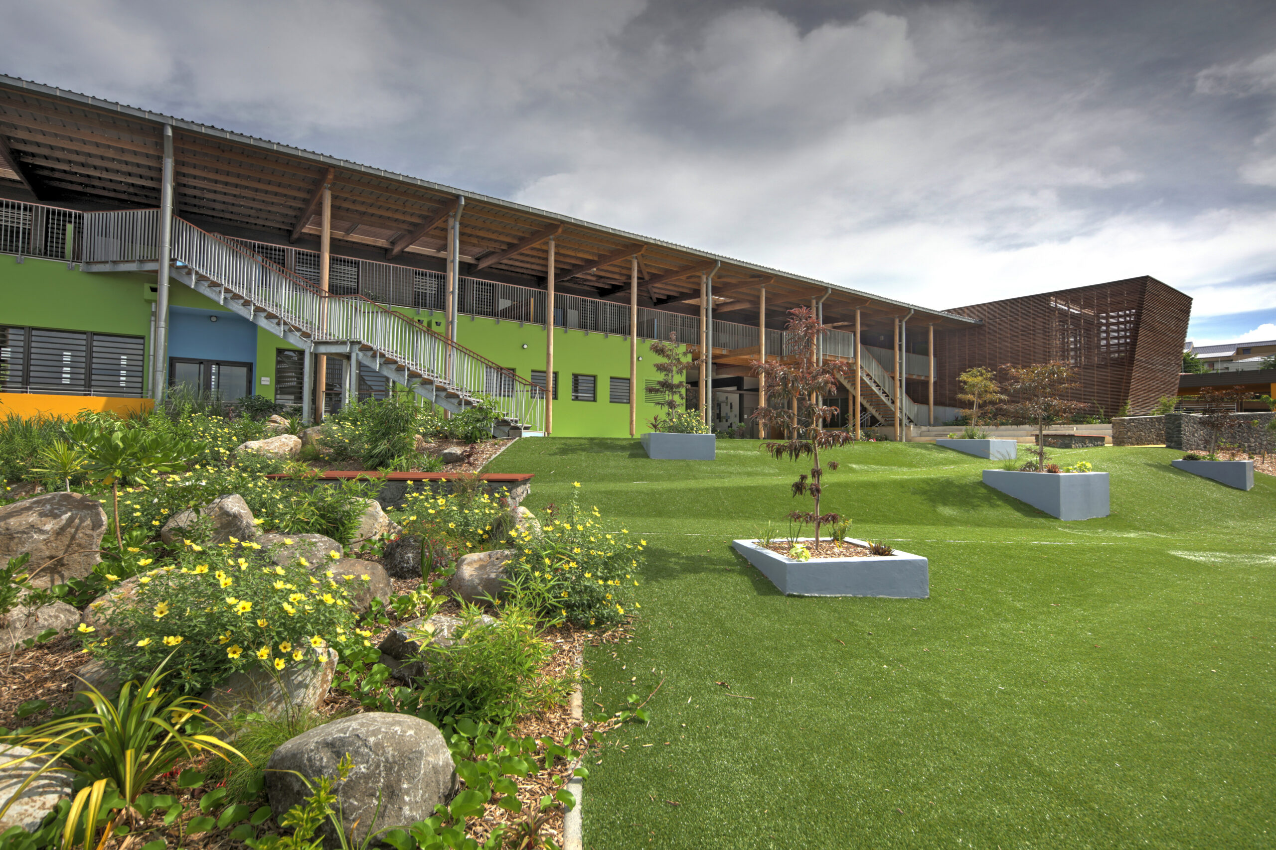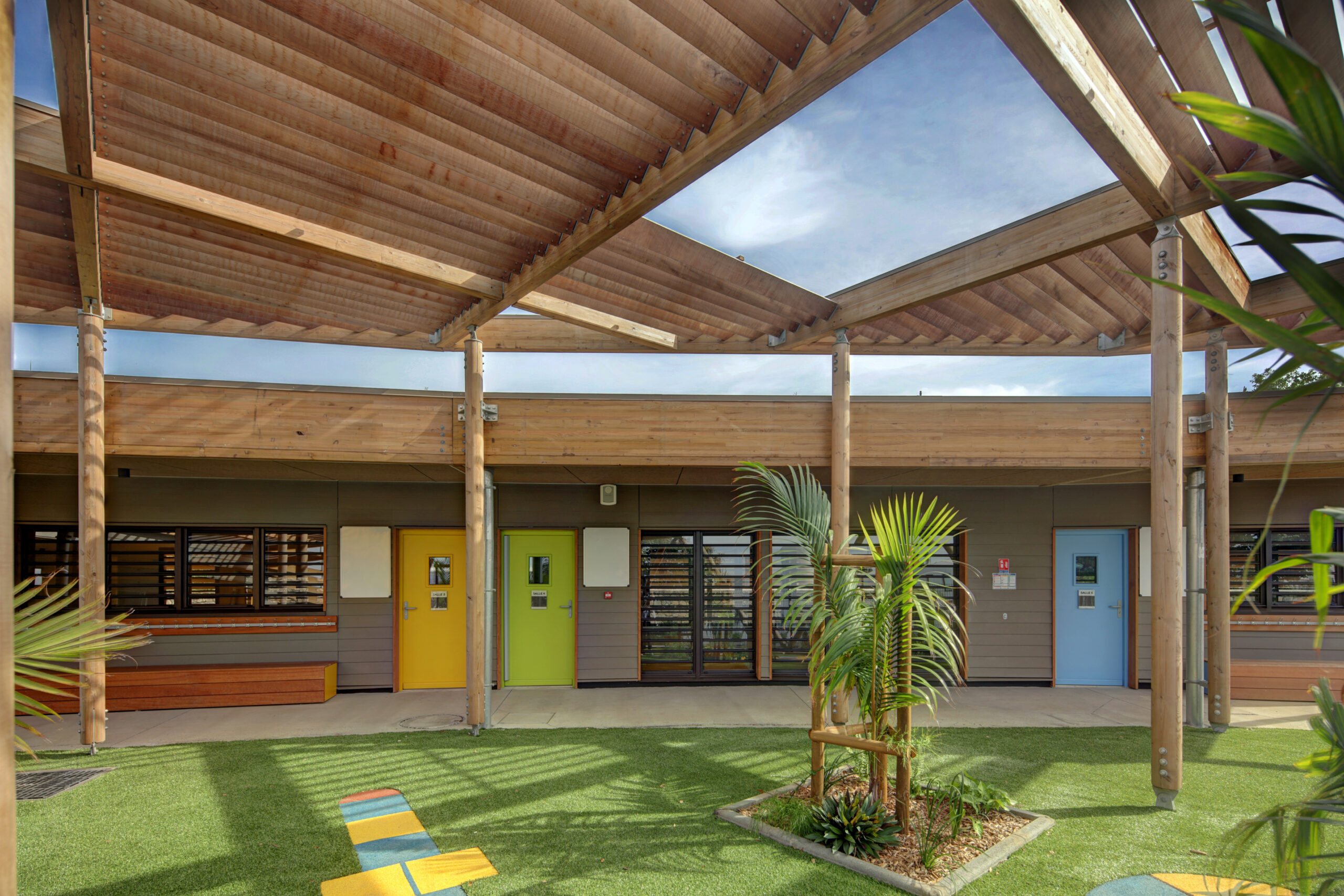 Le groupe scolaire Aimé Césaire est un établissement bioclimatique conçu selon le référentiel PERENE. Il accueille environ 300 élèves et constitue le premier lieu d’expérience des enfants avec le cadre éducatif. Ainsi, l’architecture a été pensée pour offrir des repères spatiaux, visuels et sensoriels, favorisant l’orientation et le bien-être des élèves.