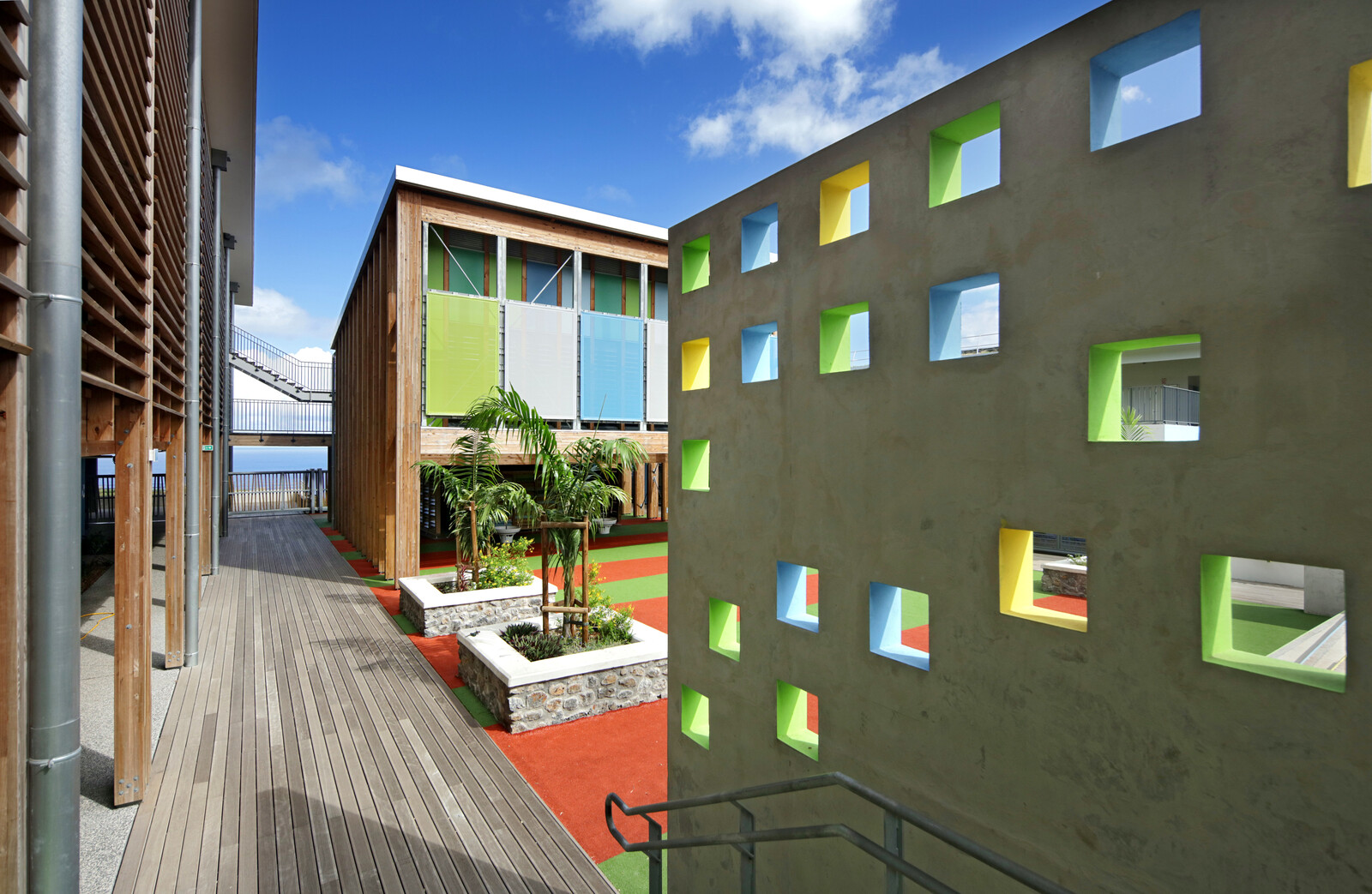 Ainsi, le groupe scolaire Mario Hoarau offre des espaces fonctionnels, lumineux et sûrs, conciliant bien-être, sécurité et durabilité, tout en s’intégrant harmonieusement dans le quartier.