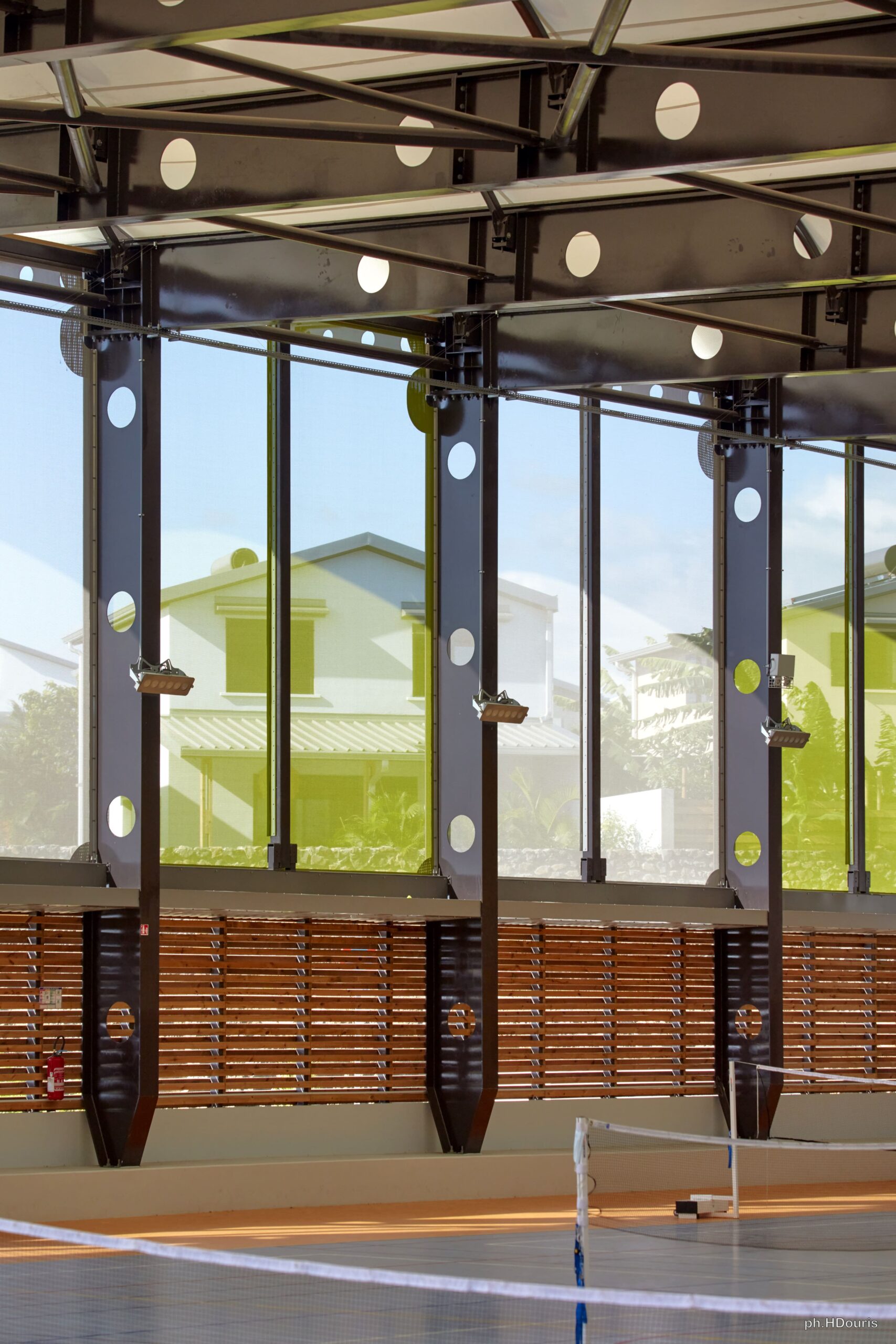 Le programme comprend aussi des locaux annexes fonctionnels. Ces espaces facilitent l’organisation des activités et le confort des usagers. Vestiaires, rangements et espaces techniques participent à la cohérence de l’ensemble. À cela s’ajoutent des équipements extérieurs intégrés, conçus pour compléter l’offre sportive du site.