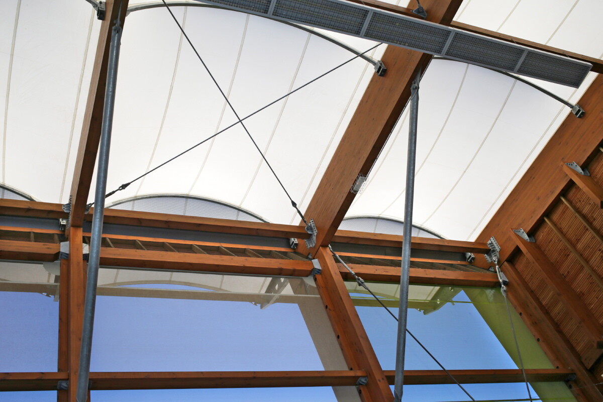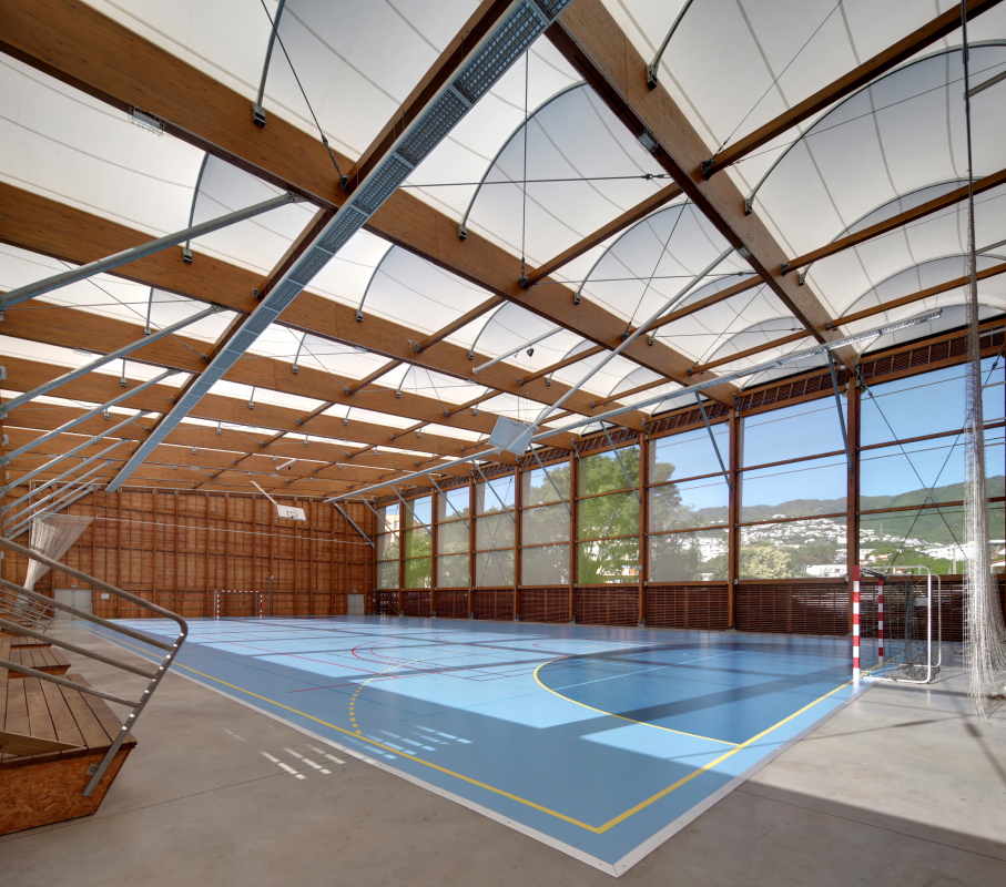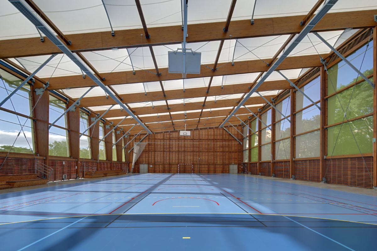 Les vents d’Est, puissants et fréquents en hiver, ont directement influencé la forme et l’orientation du gymnase. Les concepteurs ont ainsi fermé la façade exposée pour réduire les déperditions thermiques. Parallèlement, ils ont intégré des ventilations basses réglables. ce qui permet une gestion précise des flux d’air. Grâce à cette combinaison, la circulation de l’air peut être modulée selon les besoins. Ainsi, le bâtiment garantit un confort thermique constant tout au long de l’année.