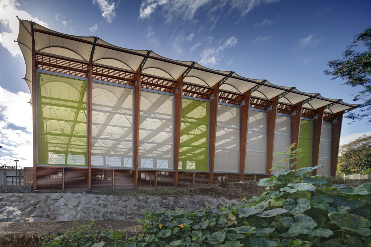 D’une part l’orientation Nord Nord-Est / Sud Sud-Ouest maximise les apports solaires utiles tout en limitant les risques de surchauffe. D’autre part, en été, les ouvertures filtrées captent les brises marines et de montagne, renforçant la ventilation naturelle. Par ailleurs, des protections solaires fixes améliorent le confort visuel et limitent l’éblouissement. En complément, un éclairage zénithal bien calibré élimine les ombres portées et maximise la lumière naturelle. r. Une forme architecturale au service du confort passif Les architectes ont conçu une toiture à pente unique qui crée un effet de tirage thermique. Cette forme génère une différence de pression entre les façade. Ce projet a été récompensé par une mention ‘Énergie et Climats Chauds’ lors des Green Solutions Awards 2017 France.
