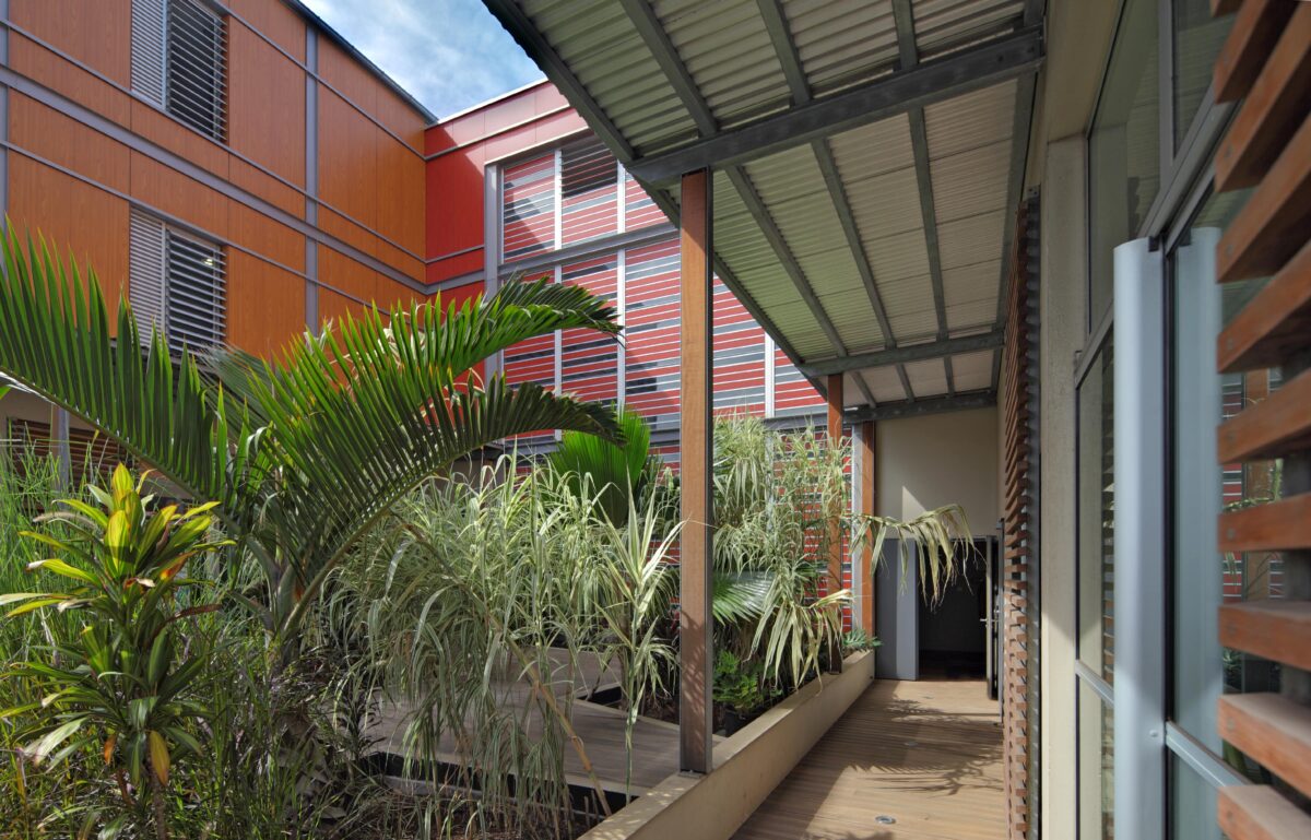 Le projet adopte une approche bioclimatique fondée sur des dispositifs passifs tels que les brise-soleils, auvents, doublages de façades et persiennes. Ces éléments, inspirés de l’architecture tropicale réinventée, régulent naturellement la lumière et la température intérieure. Ainsi, ils améliorent le confort des utilisateurs tout en réduisant la consommation énergétique.