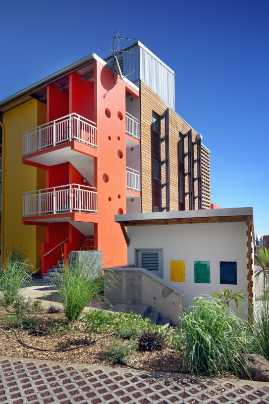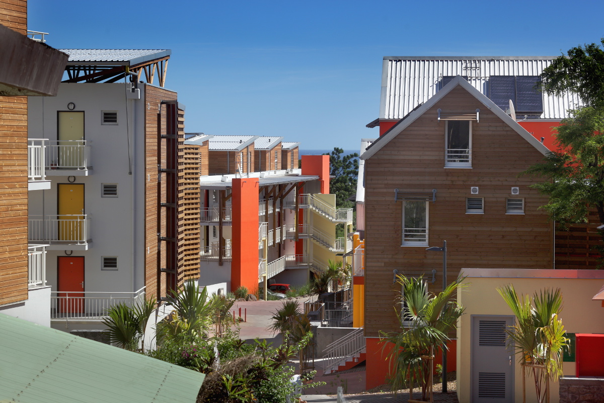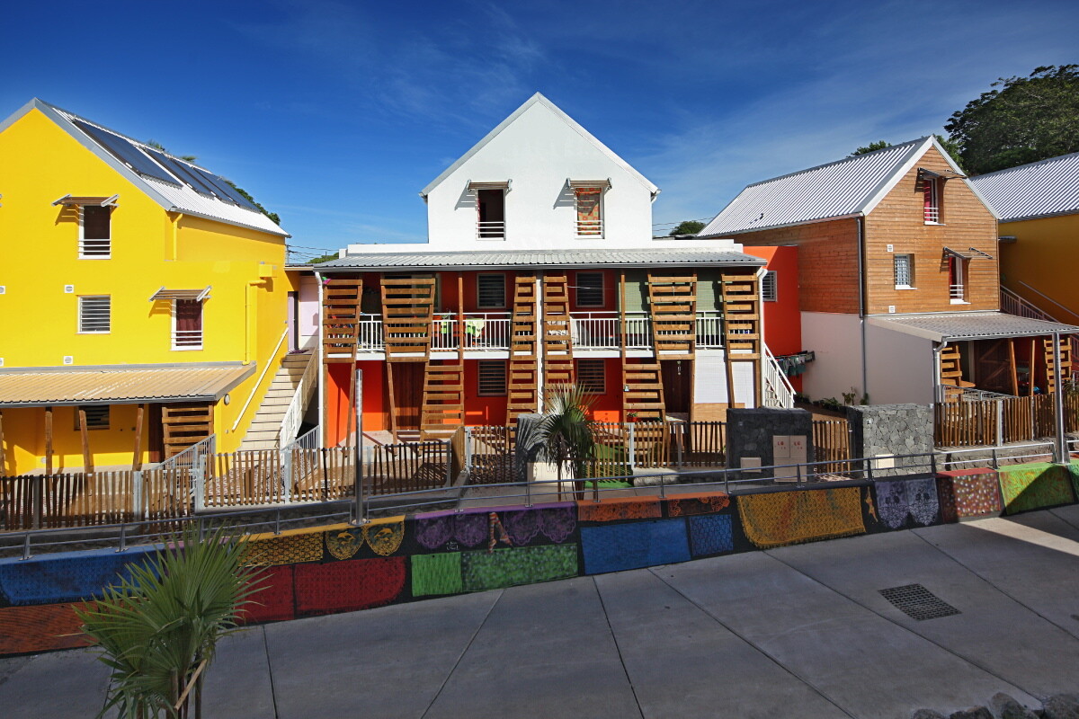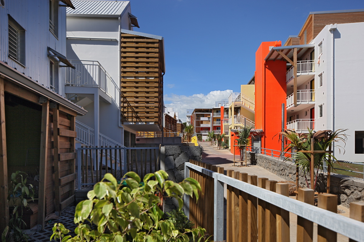 L’opération le Lavoir, située rue du Presbytère à Saint-Pierre, s’inscrit dans un secteur emblématique du centre-ville historique, au cœur du quartier vernaculaire du Lavoir. Le projet répondait à une forte demande de logements sociaux et s’intégrait dans une stratégie de requalification urbaine portée par la ville. Le site, implanté dans un talweg naturel, offre un potentiel paysager rare dans un tissu urbain dense. Le projet conserve cette respiration verte et crée une liaison douce entre la rue du Lavoir et la rue du Presbytère, devenue une véritable armature de quartier. Conçu avant l’entrée en vigueur de la RTAADom (2010), le projet anticipe les principes bioclimatiques et s’appuie sur le référentiel PERENE Zone 1.