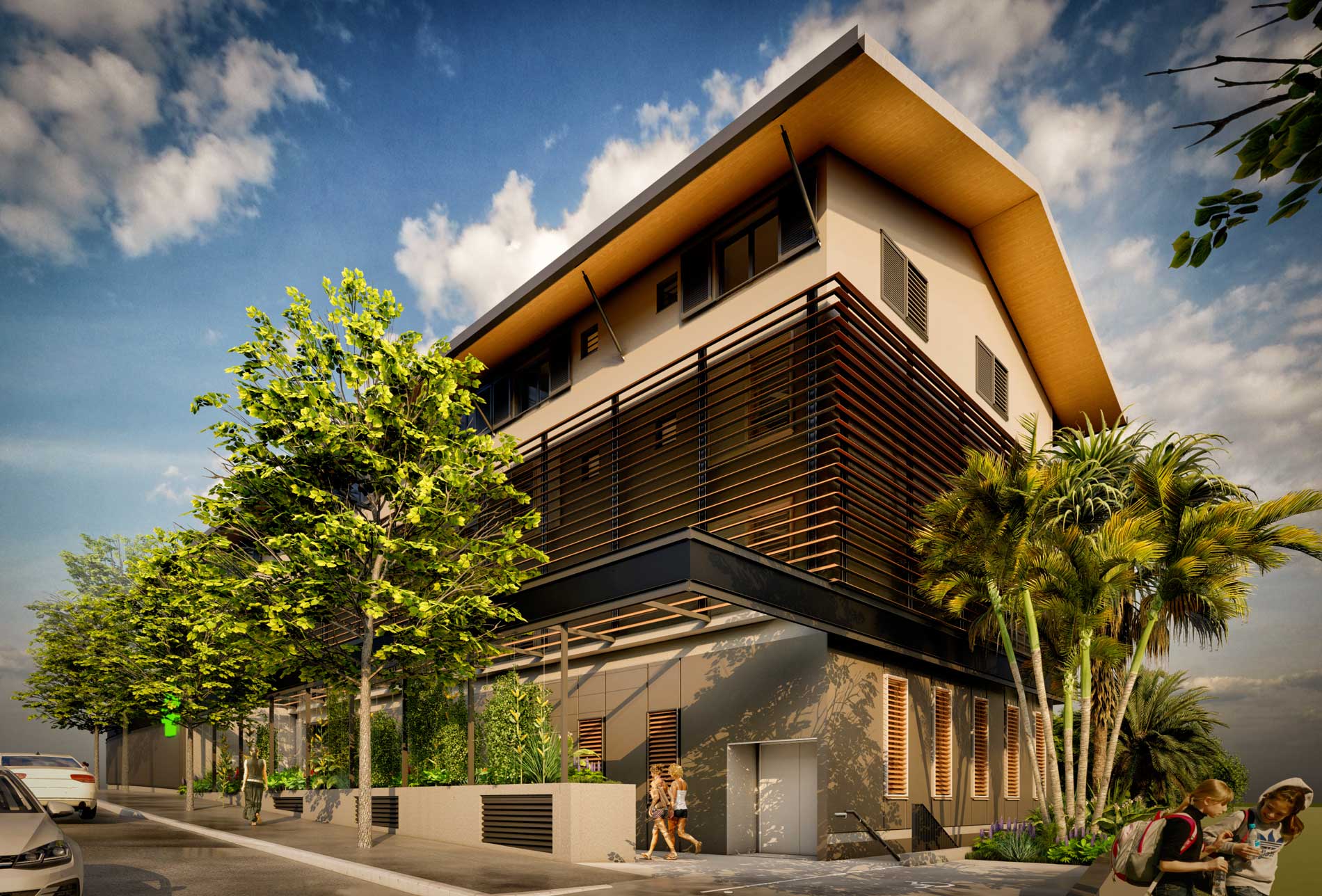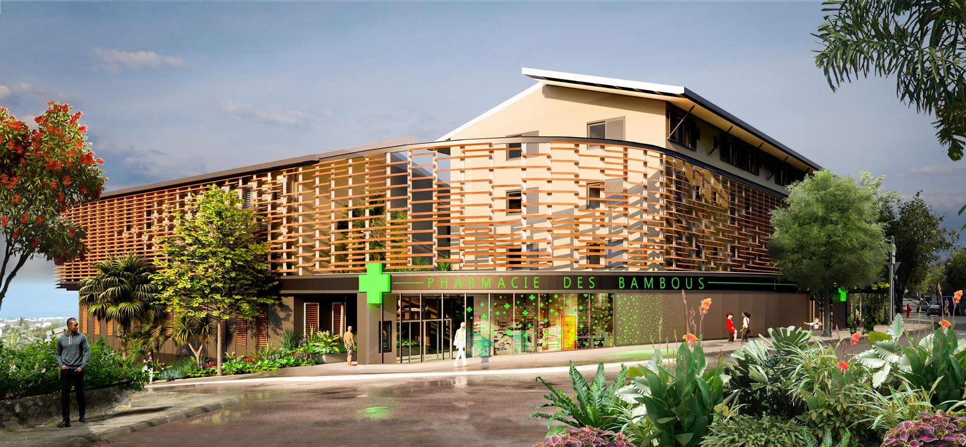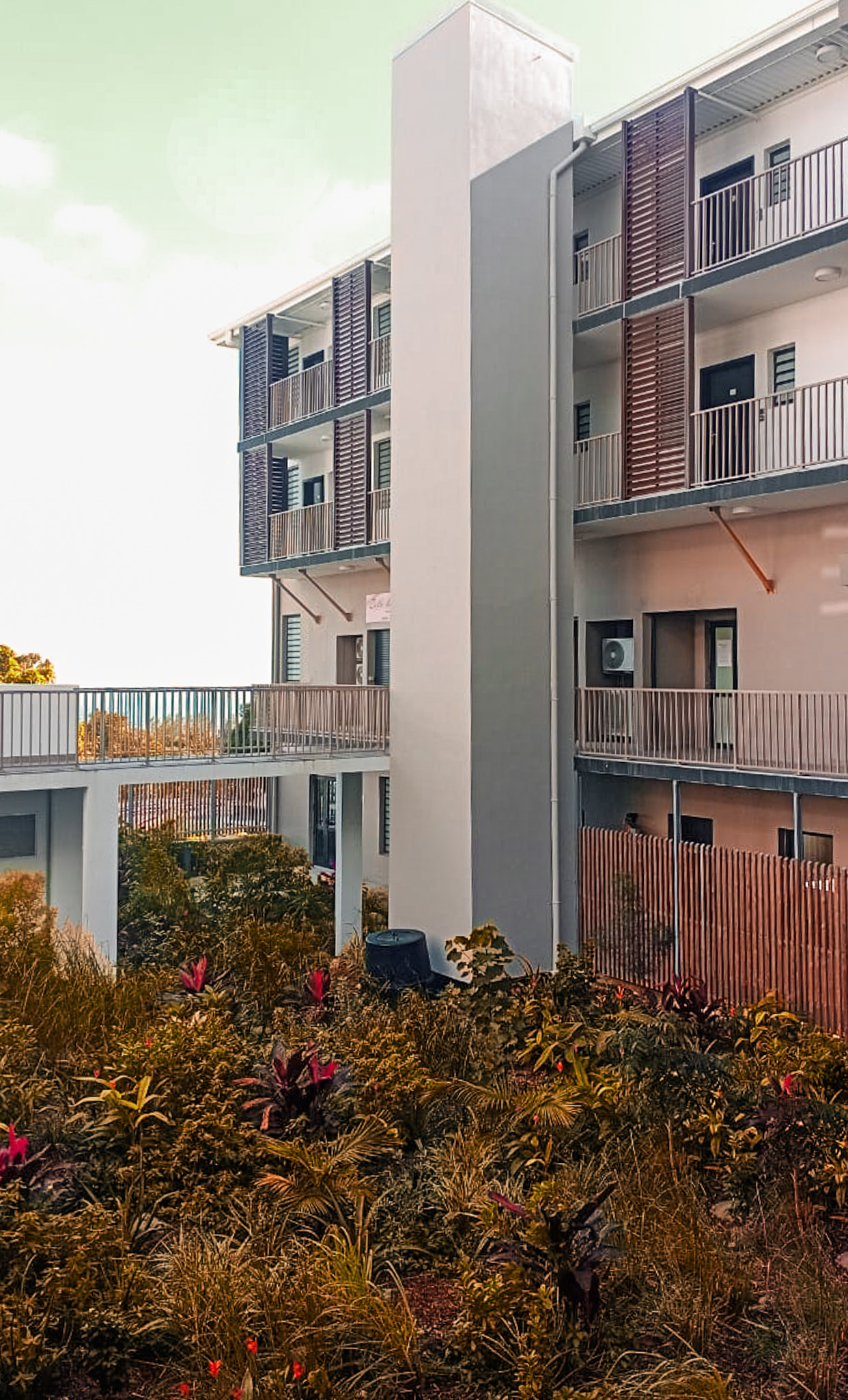 Le projet de résidence pour personnes âgées, situé à la Ligne des Bambous, s’inscrit dans un emplacement stratégique au cœur du quartier, à l’angle d’un carrefour et à proximité d’équipements publics (mairie annexe, école). Il vise à affirmer la centralité du site et à constituer un signal urbain fort.                                                                                À l’échelle urbaine, la résidence pour personnes âgées adopte une forme en U ouverte vers la mer, avec des bâtiments en périphérie de parcelle, libérant un jardin central. Ce complexe en R+3 propose des logements orientés sur ce cœur paysager, desservis par des coursives. Le rez-de-chaussée accueille des locaux de services en lien avec l’activité de la résidence, livrés bruts. À proximité de l’accès parking et de la RPA, les locaux techniques (poubelles, services) sont regroupés. Les étages supérieurs accueillent des logements de typologies T1 et T2, offrant un cadre de vie fonctionnel et adapté aux besoins des seniors.